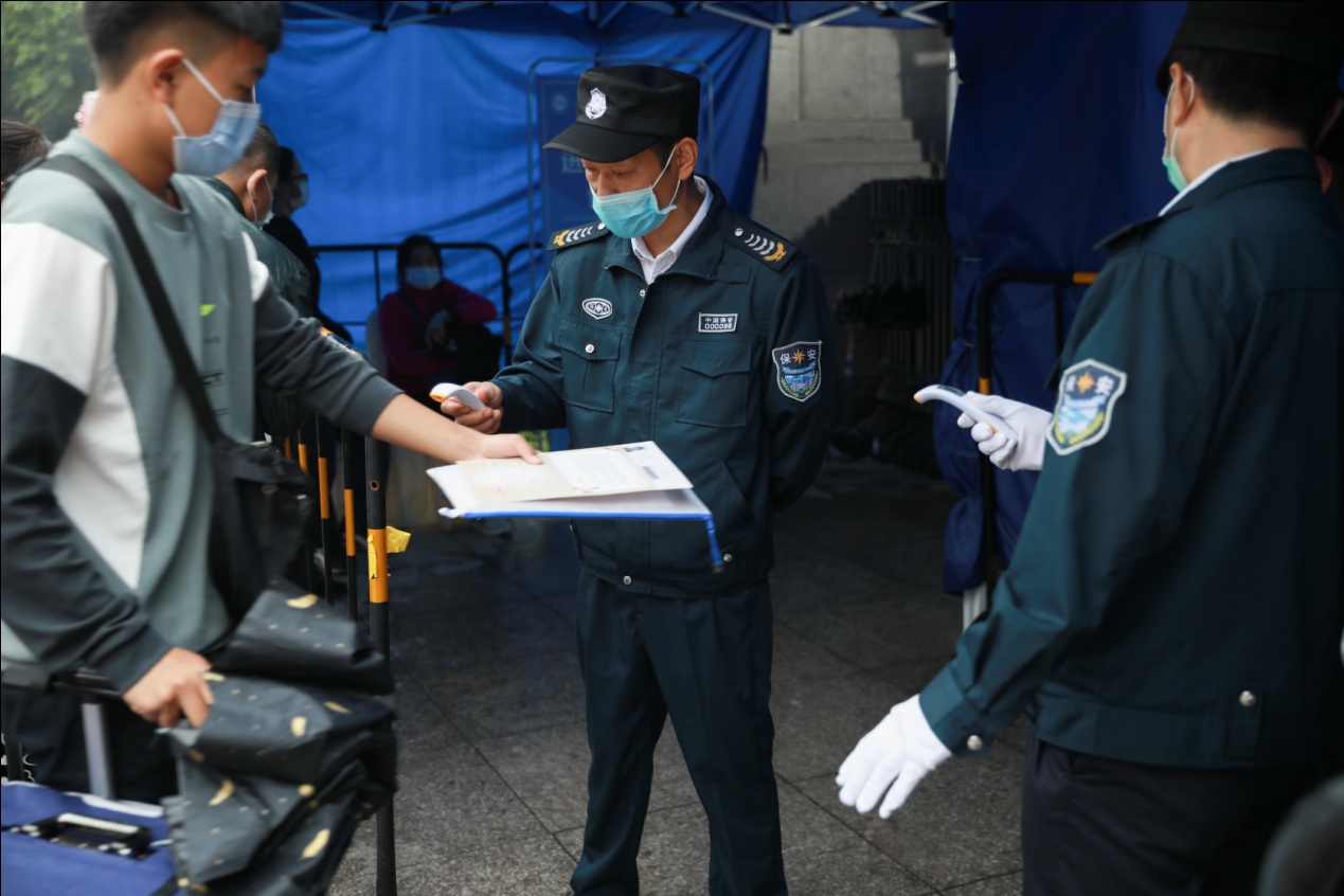 报到现场秩序井然,新生们下车后自行携带行李,戴好口罩,与前一新生间隔1米排队等候入校。新生排队时,自觉准备好当地或全国一体化政务服务平台健康码、身份证和录取通知书,并主动向现场工作人员出示,有序经过测温通道进入学校。