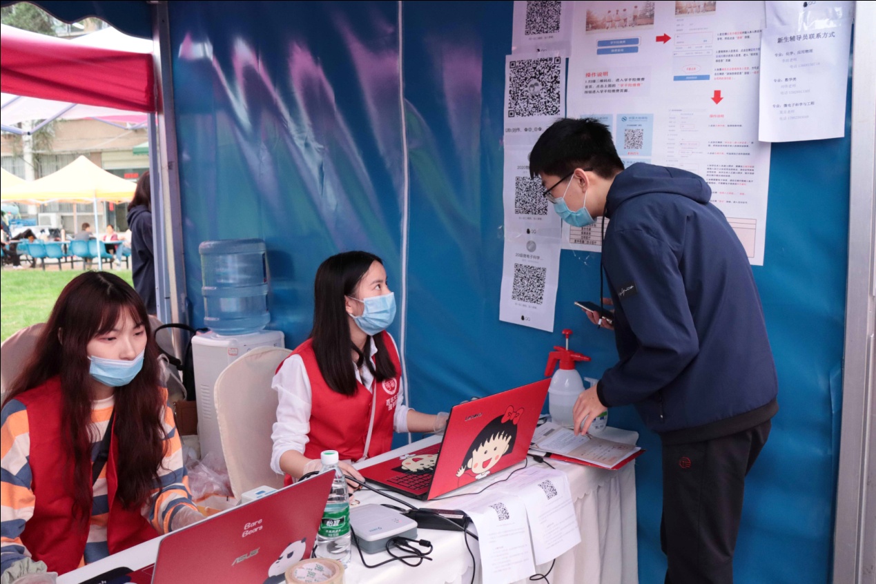 清一色的蓝色帐篷里,工作人员正有条不紊地忙碌着。今年简化了报到流程,新生来到学院报到点,只用一扫码,便能获得学生的全部信息,包括辅导员、寝室号、学生进校后的安排等等信息,现场立即打印交给新生。辅导员和学院领导也在接待点迎接新生,为他们答疑解惑,并就报到流程和进校生活耐心地叮嘱学生。