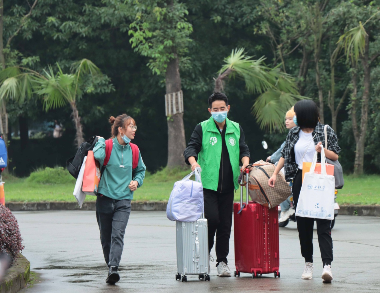 “我们匆匆吃了早饭就在这里等候了。”一位来自经济学院的志愿者这样说到,在这一个小时里他已经来回穿梭在南门门口和学院点的帐篷四五次了。由于疫情影响,常常能看见三四个志愿者帮一个新生拿取行李,帮新生打伞。虽然雨水淋湿了自己,但他们却没有丝毫疲惫,只有热情与激动。