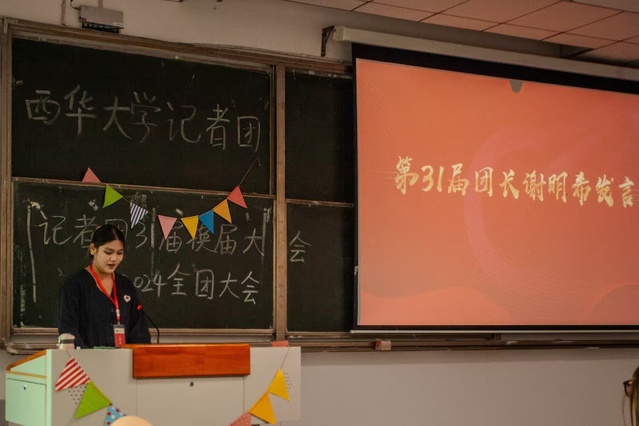 随后,第31届记者团团长谢明希发言。谢明希向记者团第30届成员的辛勤付出表示感谢,并代表第31届记者团全体成员表明了勇担责任、积极进取的信心,以及创新发展的决心。谢明希的发言让新成员们明确自己在记者团的职责,也让新成员们对未来的发展充满动力。