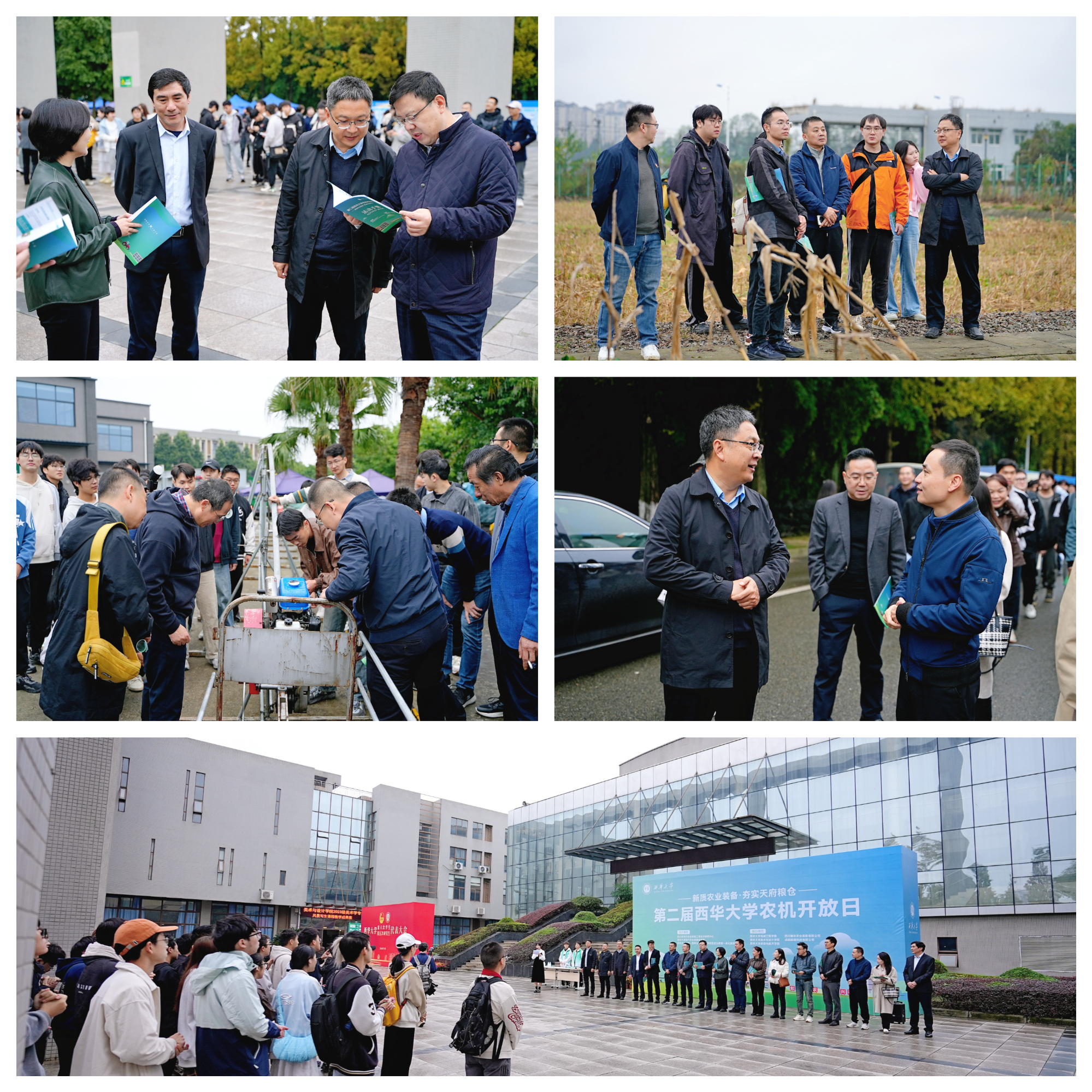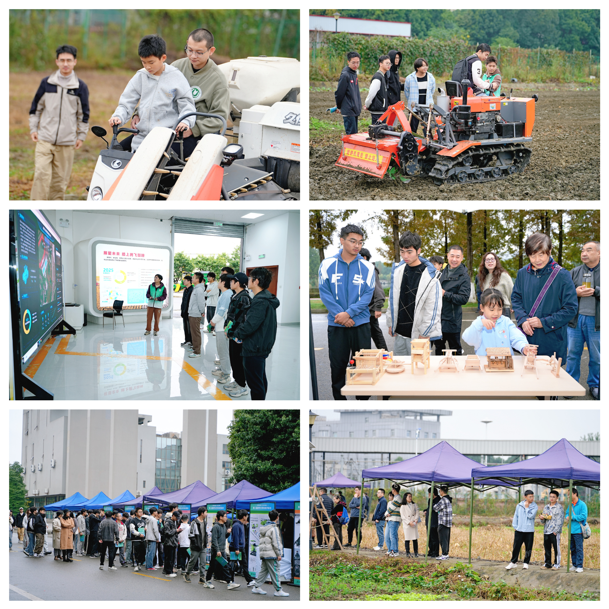 秋风送爽,金色田野与天籁湖见证了一场农机科普盛会。11月10日,第二届西华大学农机开放日在西华大学校内成功举办。本次活动以“新质农业装备,夯实天府粮仓”为主题,由四川省现代农业装备工程技术研究中心、西华大学现代农业装备研究院、农机文化之旅——西华大学大中小学思想政治教育一体化教育基地主办,西华大学机械工程学院、美术与设计学院、航空航天学院,四川耀农农业装备有限公司、成都越疆科技有限公司协办。活动涵盖了农机工业设计作品展示、古代农具与现代农业装备模型展示、低空飞行农业场景展示、学科竞赛优秀作品展示、现代农业装备研究院科研成果展示以及大田作业演示、互动体验等内容。第二届西华大学农机开放日相较于首届开放日,展出作品数量更多,参与范围更广,形式更灵活多样,互动体验感更强,吸引了校内师生和社会各界人士超过500人参与。