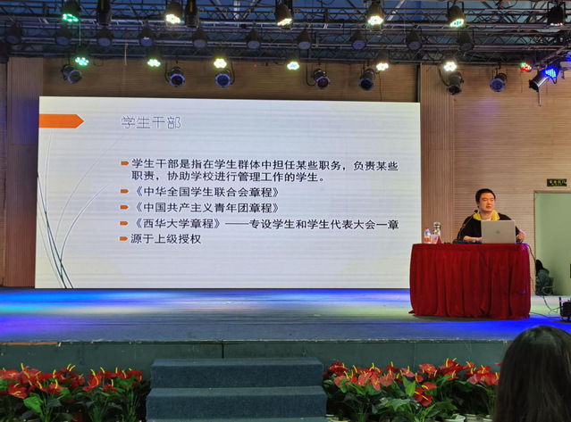 接着,易宇峰老师以“学生干部的担当”为主题进行授课,他指明何为学生干部、学生干部应当做什么、遵循什么样的干部原则。易宇峰老师强调学生干部作为学校和广大学生之间的桥梁,应当有个人担当,在信仰的传承中诠释初心的意义,在奋斗中绽放生命的光芒,是各位学生干部的重要目标。他鼓励学生干部应当在奋斗中永远铭记担当精神,并且应当在学习和工作中以相应的规定和章程来严格要求自己。