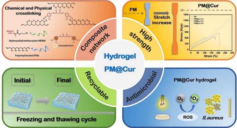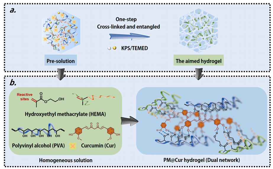 本研究通过化学交联和氢键相互作用成功制备了一种基于姜黄素(Cur)的新型双拓扑网络(DN)水凝胶冷却介质PM@Cur,首先利用甲基丙烯酸羟乙酯(HEMA)在过硫酸钾(KPS)和双甲基丙二酰胺(MBA)的作用下被引发并交联形成首个交联网络,聚乙烯醇链(PVA)贯穿其中;随后,游离的Cur通过与PVA及HEMA侧链的羟基形成分子间氢键,进一步构建复合型水凝胶冷却介质PM@Cur。在此过程中,得益于物理缠结和化学交联的协同作用,水凝胶冷却介质PM@Cur展现出显著增强的机械性能,为冷却介质研发提供了新的解决方案。