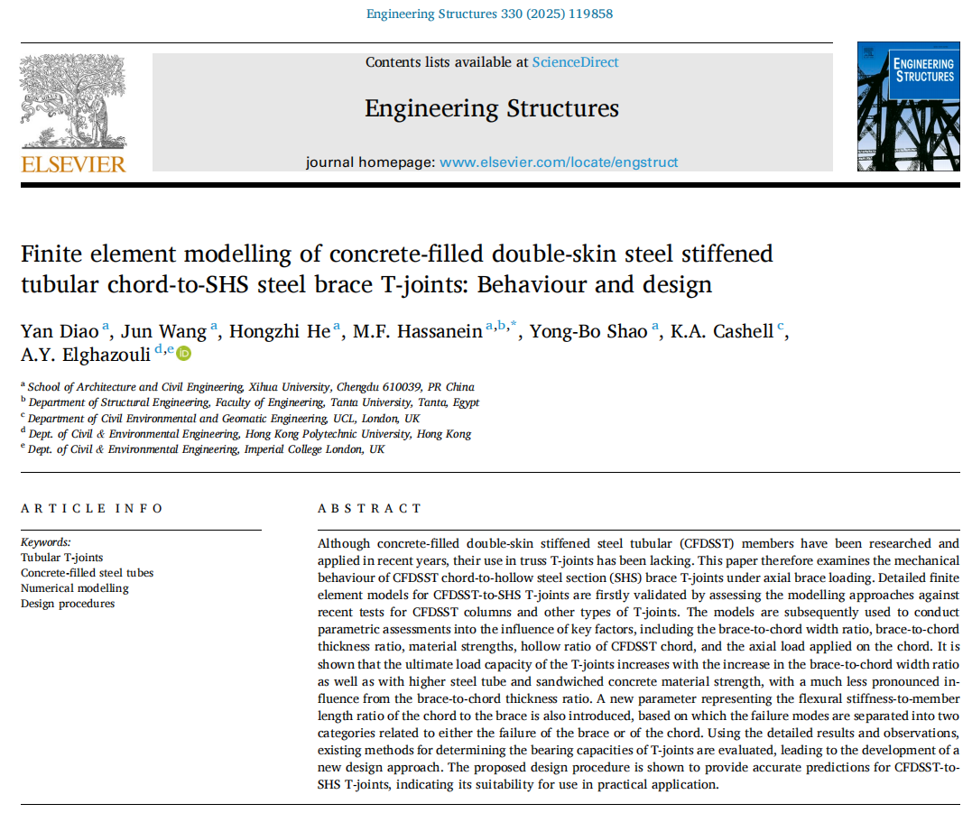 论文《Finite element modelling of concrete-filled double-skin steel stiffened tubular chord-to-SHS steel brace T-joints: Behaviour and design》以西华大学为第一单位,刁砚教授为第一作者,建筑与土木工程学院外籍教师哈桑尼教授为通讯作者,西华大学的邵永波教授、伦敦大学学院的K.A.Cashell教授,帝国理工大学的A.Y.Elghazouli教授参与了该论文的工作。论文主要研究了中空夹层带肋钢管混凝土T形节点的力学性能。钢管混凝土作为一种广泛运用于建筑和桥梁工程中的受力结构,研究其结构形式的新颖性和受力的合理性对于工程实践有重要意义。