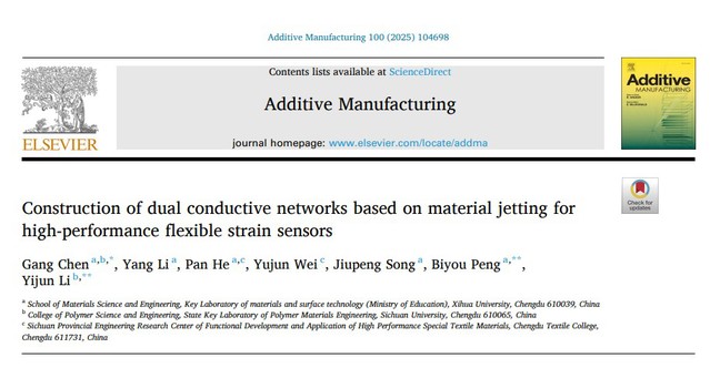 近日,材料科学与工程学院彭必友教授团队在增材制造领域顶级期刊Additive Manufacturing(中科院1区TOP,IF=10.3)在线发表了题为“Construction of dual conductive networks based on material jetting for high-performance flexible strain sensors”的研究论文。材料学院陈刚副教授为第一作者兼通讯作者,2022级硕士研究生李洋为该论文的第二作者,彭必友教授和四川大学李怡俊副研究员为共同通讯作者,西华大学为论文第一单位。研究工作得到了国家自然科学基金、有机无机复合材料国家重点实验室开放课题、四川大学与中国核动力研究院院校联合基金等项目的支持。
