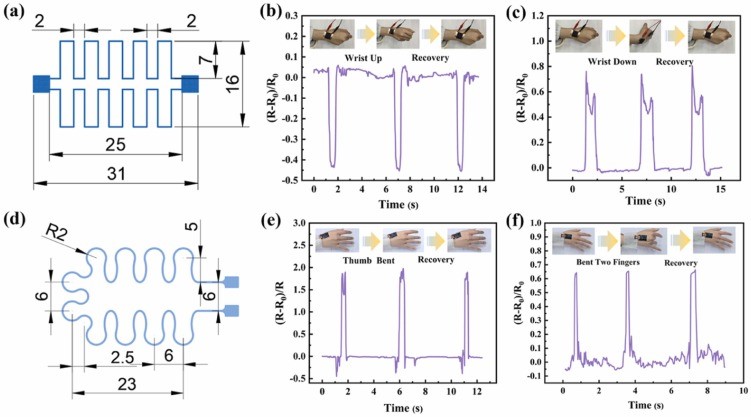 着智能穿戴设备和物联网技术的快速发展,柔性应变传感器在健康监测、人工智能及机器人等领域展现出广阔的应用前景。提升柔性传感器的灵敏度、应变响应范围和可靠性一直是实际应用中亟待解决的问题。通过对传感器导电网络进行图案化构筑,不仅可有效放大对微应变的响应,还能优化应力分布,显著提升传感器整体性能。据此,彭必友教授团队利用气溶胶喷射打印技术(AJP)非接触、高精度及宽材料适应性的优势,制备了一种具有双导电网络结构的柔性应变传感器,并实现了导电网络结构的多种图案化形态与尺寸调控。所制备的典型蜿蜒形传感器展现了0.6–80%的应变响应范围和高达31.2的GF灵敏度。此外,传感器在经历2000次循环加载后,仍能稳定输出信号,具有良好的循环稳定性。进一步的,借助AJP技术的图案化优势,研究团队制备了不同网格密度的应变传感器。结果表明,灵敏度与网格密度呈非线性关系,在2×6网格配置下,传感器的GF最高可达47.52,突出了图案化设计的优势。基于AJP打印的应变传感器在人体运动监测、摩尔斯编码通信及UAV飞行状态监测等应用场景中表现出色。该研究不仅成功实现了在柔性衬底表面构建图案化的导电网络结构,还为其它柔性电子器件的设计与构筑提供了新思路。