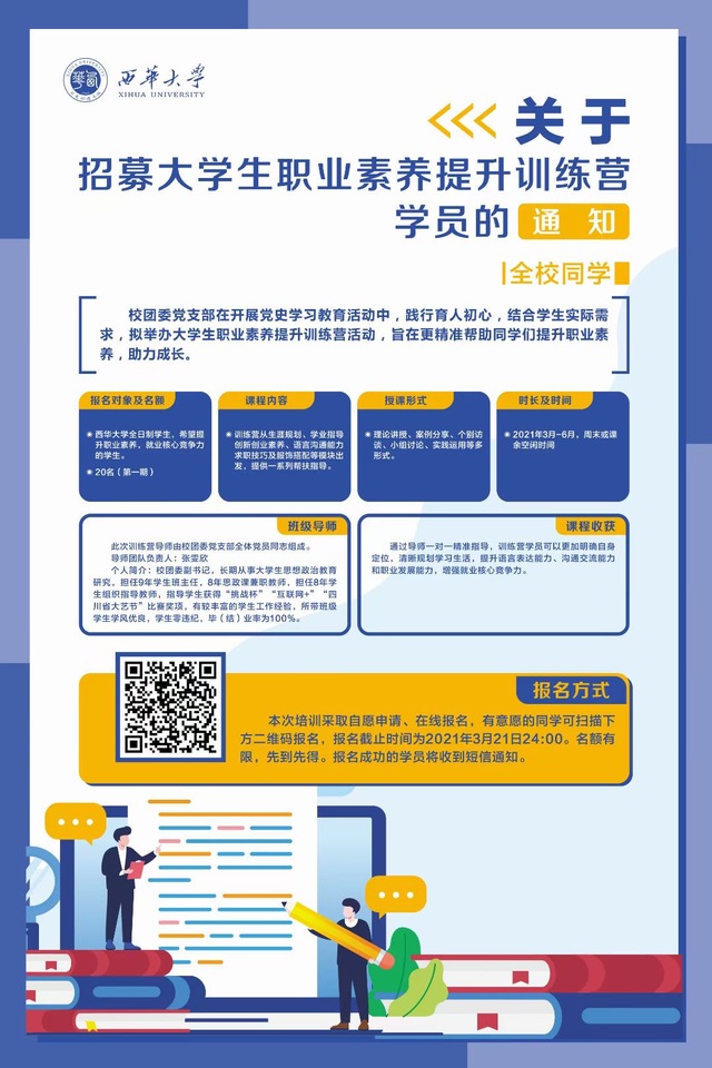 本次活动面向全校希望提升职业素养、就业核心竞争力的学生,计划第一期招募20名。校团委党支部全体党员担任导师团成员,主要从生涯规划、学业指导、创新创业素养、语言沟通能力、求职技巧及服饰搭配等模块出发,提供一系列帮扶指导。