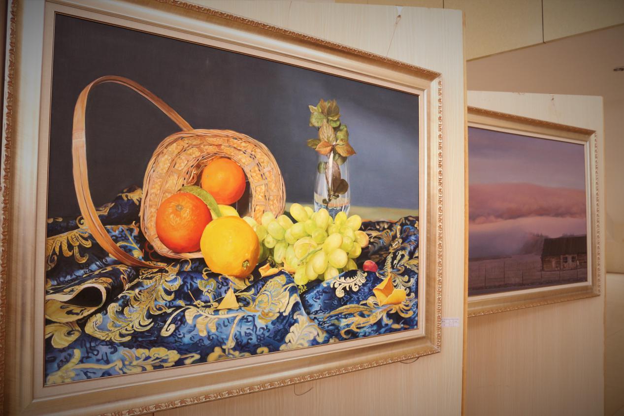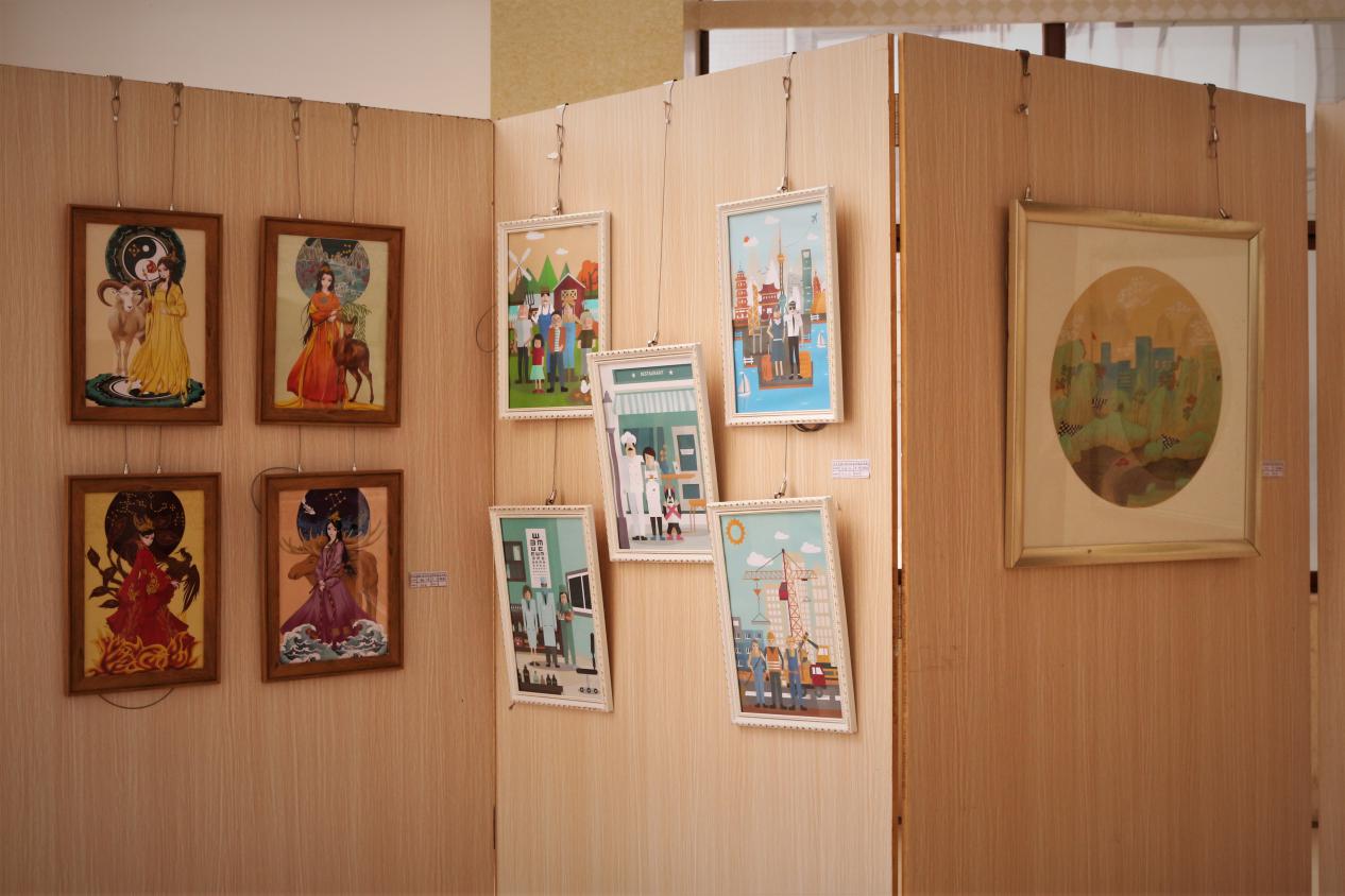 展出作品中,呈现出美术与设计学院莘莘学子在大学学习中的大胆新颖与生活积淀。《共生》、《并蒂》等国画作品在传统技法中加入新鲜养分,当代元素的添加使视觉效果更加有韵味,让观者感受沉静的同时又感受到了来自画者特设的乐趣。《福兴街178号》、《凋枯》、《颜色》等水彩作品细腻而又明净,展现出了画者对水彩绘画技法的掌握功力。众所周知,水彩画种对画者的技法和材质把控能力要求十分严格,看似简单,实则难度很大,正如作家靠不断的文字训练来寻找最适合自己的写作途径一样,绘画也得靠画者通过一遍又一遍的练习才能找到最适合自己的表现方式与独特的绘画语言。《远离喧嚣》、《静物》这两副油画作品,通过画者在头脑中对画面的反复分析,细节的处理与色调的掌控、主体物的摆放与结构的划分等等都一一体现在了整幅画面中。《远离喧嚣》中的大面积冷色调,给人印象深刻,深灰色的天空与远山令观者心情沉重压抑,鲜艳的近景又让观者感到温情,最终一切归于宁静。古典写实油画大多给人以似真似假的直面感受,《静物》中的每一片叶和每一滴水珠都让人摸不透虚实,水果从画者的手中苏醒过来,果香味在展厅上方弥漫散开。设计系同学带来的《和谐一家》系列、《朱雀七宿》系列等插画作品也给人带来耳目一新的视觉感受。