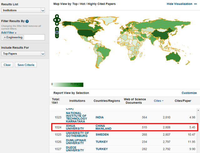 最新数据(覆盖时间为2010年1月1日—2020年2月29日)显示,我校近十年全部学科领域共发表ESI论文1918篇,总被引用10646次,篇均被引用5.55次,高被引论文14篇。其中,工程学领域共发表ESI论文515篇,总被引用2808次,篇均被引用5.45次,高被引论文4篇。全球进入ESI前1%的机构共有6455个,我校位列4715名(在中国内地科研机构中名列第432位);进入工程学ESI前1%的机构有1541个,我校位列1524名(在中国内地科研机构中名列第228位)。