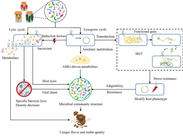 Figure 2. Impacts of phages with different life cycles on vegetable fermentation processes (Virulent phages lyse host cells to release intracellular components, directly contributing to substrate transformation. The viral shunt regulates population densities of dominant species to maintain biodiversity. In contrast, temperate phages exert their effects via: (a) integration of AMGs into host metabolic networks to enhance metabolic capacity and optimize flavor compound synthesis; (b) HGT mediating the dissemination of virulence factors, antibiotic resistance genes, and environmental adaptation genes (e.g., acid tolerance genes) among microorganisms. This process confers novel functional traits to hosts, significantly improves their niche adaptation capabilities, and is a key driver of microbial community evolution. Collectively, these phage-host interactions maintain the dynamic equilibrium of microbial communities).