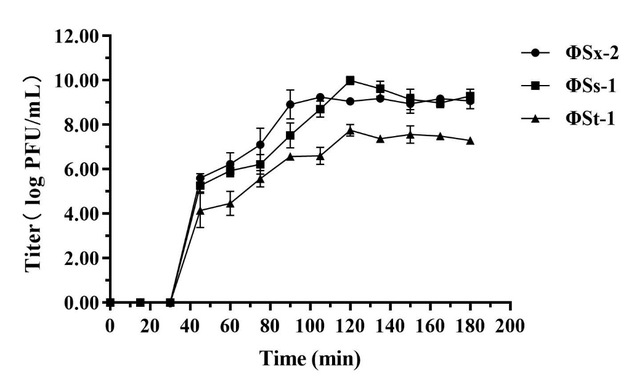 Figure 2. The one-step growth curves of phages ΦSx-2, ΦSs-1, and ΦSs-2 infecting their host bacteria in TSA medium (Circle: Growth curve of ΦSx-2; Square: Growth curve of ΦSs-1; Triangle: Growth curve of ΦSs-2). The values shown in the figures are the averages of three experiments.