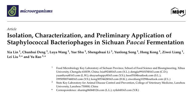 近日,食品与生物工程学院农产品贮藏与加工团队饶瑜教授等人在国际食品顶级期刊《Food Microbiology》(Q1,IF:4.6)发表题为“Ecological presence and functional role of bacteriophages in fermented vegetables”的综述论文。在国际微生物学领域权威期刊《Microorganisms》(Q2,IF:4.2)发表题为“Isolation, Characterization, and Preliminary Application of Staphylococcal Bacteriophages in Sichuan Paocai Fermentation”的论文。西华大学硕士研究生林霞为论文第一作者,西华大学饶瑜教授和兰州大学刘蕾青年研究员为论文共同通讯作者,西华大学为论文第一完成单位。