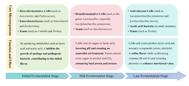 Figure 1. Core microbial types and their functional roles at each stage of the vegetable fermentation process.