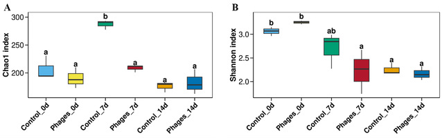 Figure 5. Temporal changes in alpha diversity indices during paocai fermentation. (A) Chao1 index showing community richness; (B) Shannon index indicating community diversity. Error bars represent standard deviations of triplicate biological replicates(n=3).