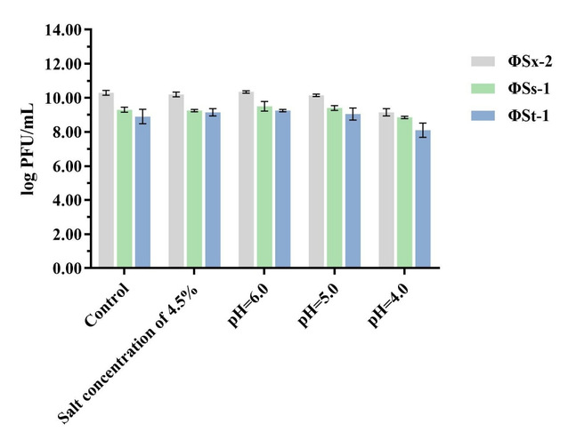 Figure 3. The survival of phages ΦSx-2, ΦSs-1, and ΦSs-2 under high salt concentration and low pH conditions. The values are the mean of three experiments, which showed no significant differences.