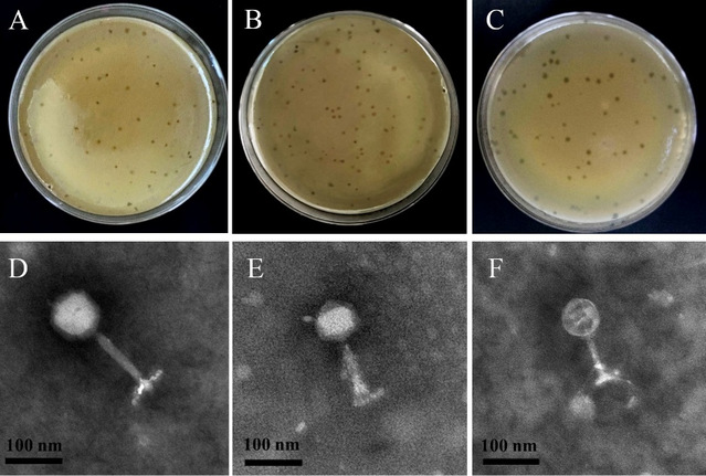 Figure 1. The plaque morphologies of phages ΦSx-2 (A), ΦSs-1 (B), and ΦSs-2 (C), as well as the transmission electron microscope images of phages ΦSx-2 (D), ΦSs-1 (E), and ΦSs-2 (F). Scale bar = 100 nm.