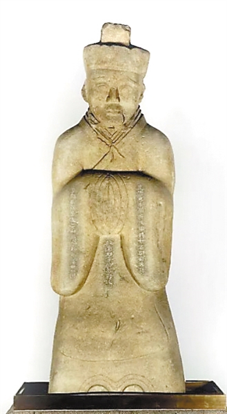 陈列于都江堰离堆公园伏龙观内的李冰石像。资料图片