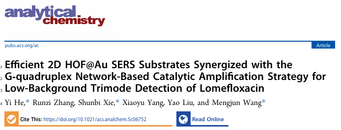 近日,理学院何毅课题组及合作者在分析化学TOP期刊《Analytical Chemistry》(中科院一区,自然指数期刊,IF=6.7)发表题为“Efficient 2D HOF@Au SERS Substrates Synergized with the G-quadruplex Network-Based Catalytic Amplification Strategy for Low-Background Trimode Detection of Lomefloxacin”的研究论文。何毅博士为该论文第一作者兼通讯作者,2023级硕士研究生张润滋为学生一作,西华大学为第一通讯单位。