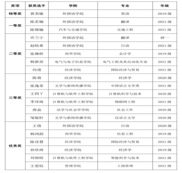 本次比赛共有230多本优秀笔记参与评选,参赛学生可将本学期开设的任一门专业课或公共课的课堂笔记上交参评。经过前期竞争激烈的比拼,共有20本课堂笔记进入决赛,决赛采用网络投票的方式进行,最终决出特等奖1名,一等奖2名,二等奖5名,三等奖6名。具体获奖情况为:外国语学院黄美敏获特等奖;外国语学院陈若楠、汽车与交通学院陈锶榆获一等奖;外国语学院许兰宁、外国语学院赵晗希、西华学院张琳梓、电气与电子信息学院杨新苗、经济学院向进获二等奖;经济学院陈萌、文学与新闻传播学院张逸菲、计算机与软件工程学院王四丫、计算机与软件工程学院李诗语、法学与社会学学院唐晶、文学与新闻传播学院皱妮轩获三等奖。