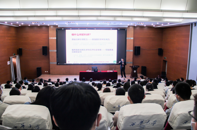 王玉忠以“选择与奋斗”为主题具体讲述了自己人生历程中的三个重要选择,告知西华学子在面临不同情况时,要做出正确且合适的判断,做好自己的人生规划。他指出大学的四个主要功能:人才培养、科学研究、服务社会与文化传承,即“坚持育人为根本、科研为先导、科教紧密融合,以高水平的科研支撑高质量人才培养。”王玉忠提出当代科研的两个基本发展方向:原始创新引领前沿——增强国际学术影响力,自由探索、坚持自主创新,在原创引领的指导思想下不断实践和发展,以抢占更多的科技领域制高点为不懈的追求;服务国家战略需求和经济社会发展——撑起自主创新的筋骨,走科技、教育、经济、文化相结合的发展道路,聚焦国家重大需求,主动服务国民经济主战场。“有信心、有意志、有能力”“面向世界科技前沿、面向经济主战场、面向国家重大需求、面向人民生命健康”“坚持需求导向和问题导向”已成为当今科研人员在工作中应具备的重要素质和能力。