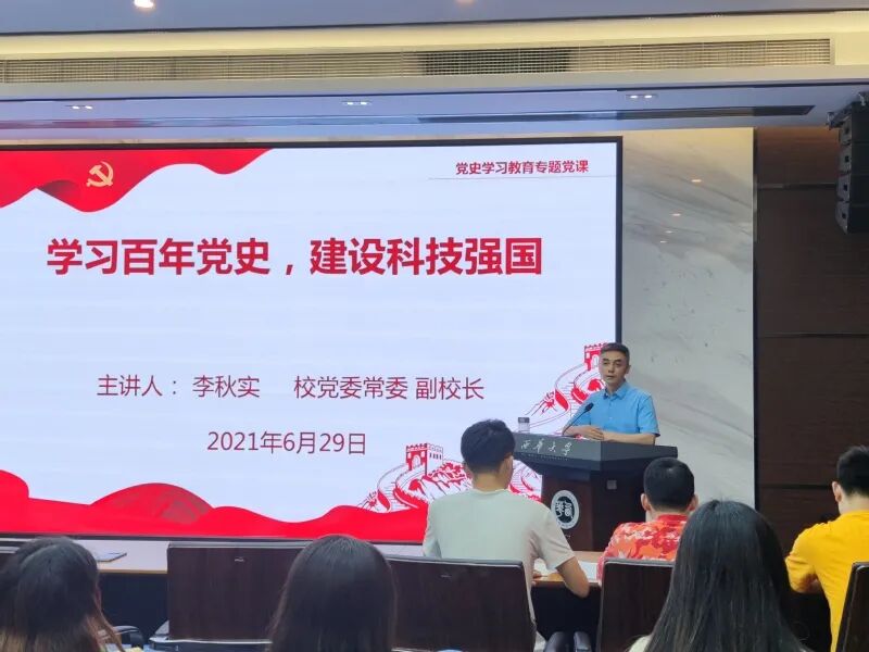 6月29日,航空航天学院学生党支部在办公楼101会议室召开党史学习教育大会,副校长李秋实以“学习百年党史,建设科技强国“为主题,从三个方面为全体党员和入党积极分子讲授了一场精彩生动的党课,并结合自身经历强调了创新的重要性。