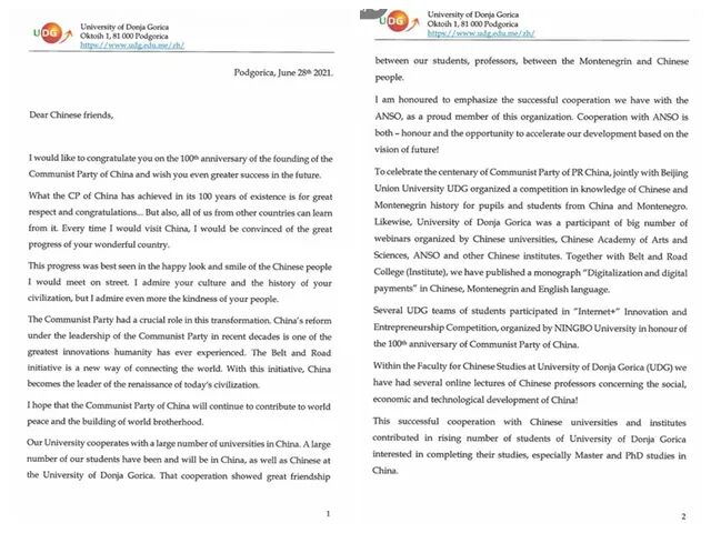 6月28日,黑山最大私立大学下戈里察大学校长韦塞林·武科蒂奇向我校致贺信,祝贺中国共产党成立100周年。2016年,我校与黑山下戈里察大学正式建立校际合作伙伴关系,多年来同该校在教师交流互派、学生双向交流、举办学术研讨会、共同申报合作项目、人文交流活动等方面开展了密切合作。