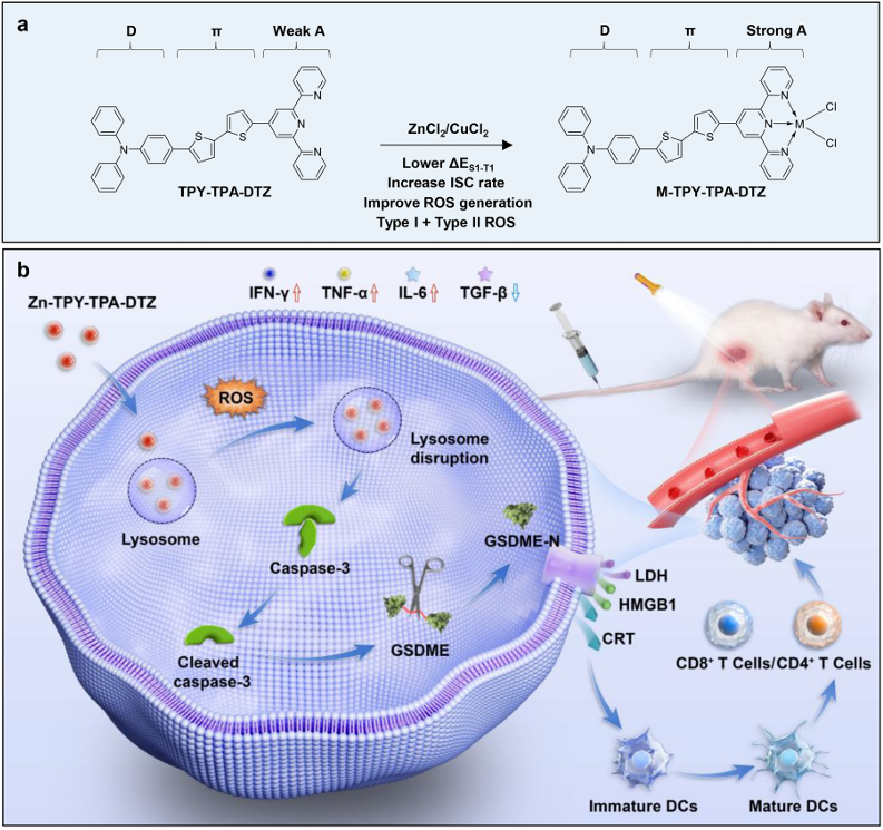 光动力疗法(PDT)因其时空精准、副作用小等优势,已成为肿瘤治疗的重要武器。然而,实体瘤内部普遍存在的“乏氧”和“免疫抑制”微环境,严重削弱了其疗效。传统光敏剂主要通过消耗氧气的II型机制发挥作用,同时单纯的细胞杀伤难以激活有效的抗肿瘤免疫,甚至可能加剧免疫抑制。团队首次利用生命必需金属Zn²⁺作为强吸电子基团,优化光敏剂分子的电子结构,合成一种显著提升活性氧(尤其是I型ROS)效率的Zn-TPY-TPA-DTZ分子,该分子通过I型(电子转移)和II型(能量转移)双机制产生活性氧,其光毒性在常氧和乏氧环境下均保持高效,性能显著优于临床常用光敏剂Ce6;Zn-TPY-TPA-DTZ还能特异性靶向并破坏肿瘤细胞溶酶体,进而激活Caspase-3/GSDME介导的细胞焦亡通路并重塑免疫微环境,形成系统性的长效免疫监视,有效抑制肿瘤生长、复发与转移,为设计高效、安全、能克服乏氧的金属基光敏剂提供了全新的理论框架和普适性策略,更成功地将化学驱动的精准光动力治疗与生物体内系统的免疫激活深度耦合,实现从“局部杀伤”到“全身免疫”的协同跃升。