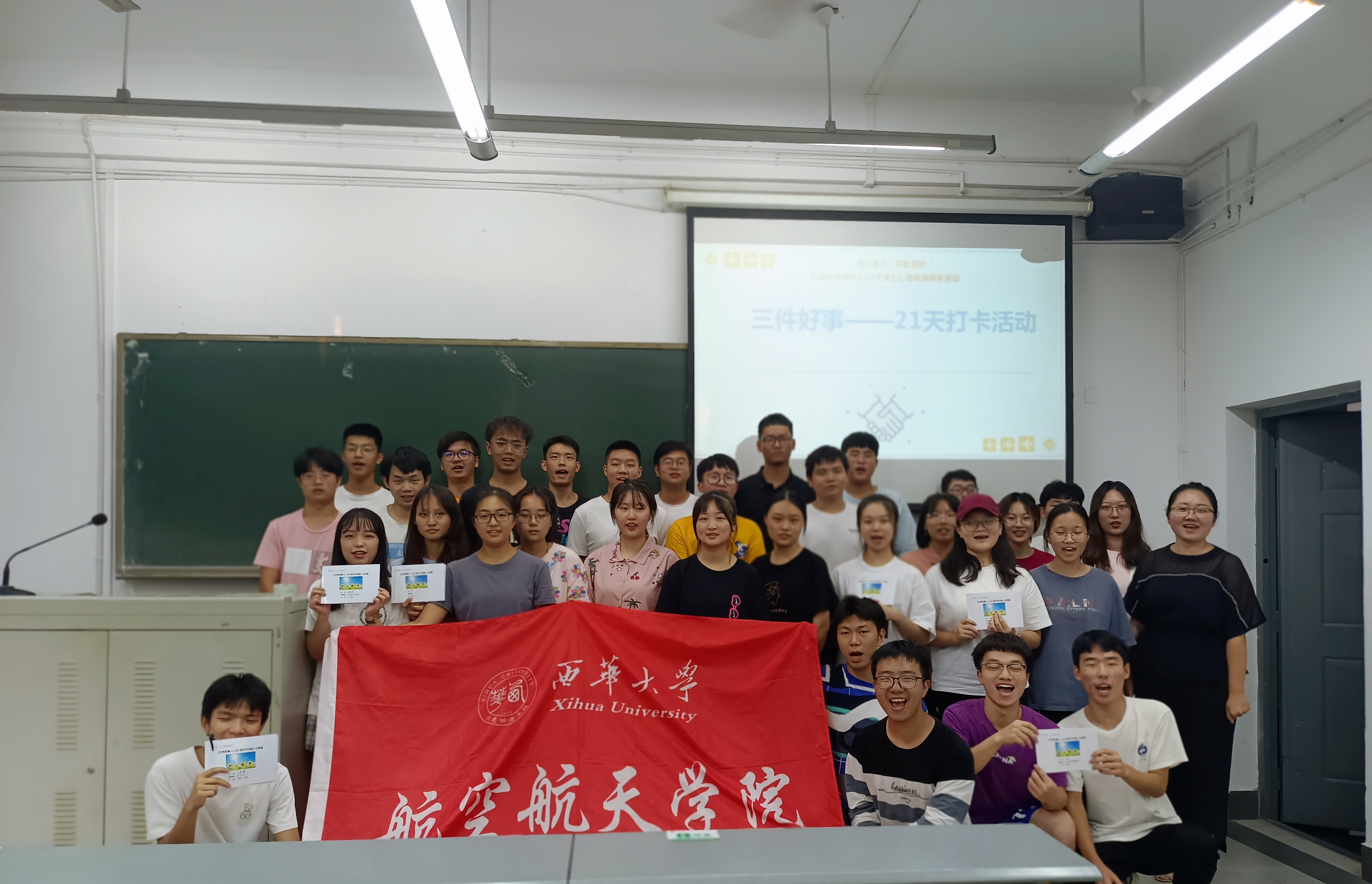 9月29日下午,航空航天学院在6C116开展“三件好事——21天打卡活动”动员会。38名志愿者和各班心理委员参加了本次会议,会议由学工办主任兼心理指导教师奉姣主持。