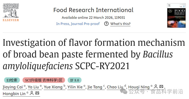 3月22日,食品与生物工程学院林洪斌教授团队在Food Research International发表题为《Investigation of flavor formation mechanism of broad bean paste fermented by Bacillus amyloliquefaciens SCPC-RY2021》的研究论文。食品与生物工程学院研究生蔡佳颖为本文的第一作者,林洪斌教授和宁厚齐老师同为本文的通讯作者。该研究以解淀粉芽孢杆菌SCPC-RY2021为对象,结合GC×GC-MS与非靶向代谢组学,系统解析了蚕豆瓣发酵过程中关键香气物质的形成机制及其代谢通路,并进一步揭示了盐胁迫对菌体生长、代谢流分配及风味生成的影响。