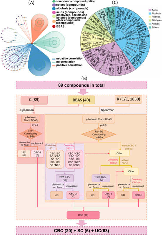 化合物、化合物比值与焦苦味评分之间Spearman相关系数网络图(A)。化合物分类流程图(B),20种潜在焦苦味化合物的风味描述(C)。C:化合物含量,R:各化合物对的含量比值,BBA:焦苦味,BBAS:焦苦味评分,ρ:Spearman相关系数,CBC:潜在焦苦味化合物,SC:协同化合物,MC:掩蔽化合物,NEC:无效化合物,UC:不确定化合物
