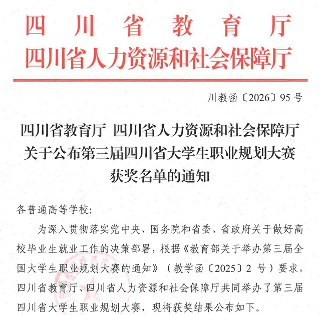 近日,四川省教育厅、四川省人力资源和社会保障厅联合发布《关于公布第三届四川省大学生职业规划大赛获奖名单的通知》(川教函〔2026〕95号)。我校师生在此次大赛中表现优异,共斩获1项金奖、2项铜奖。