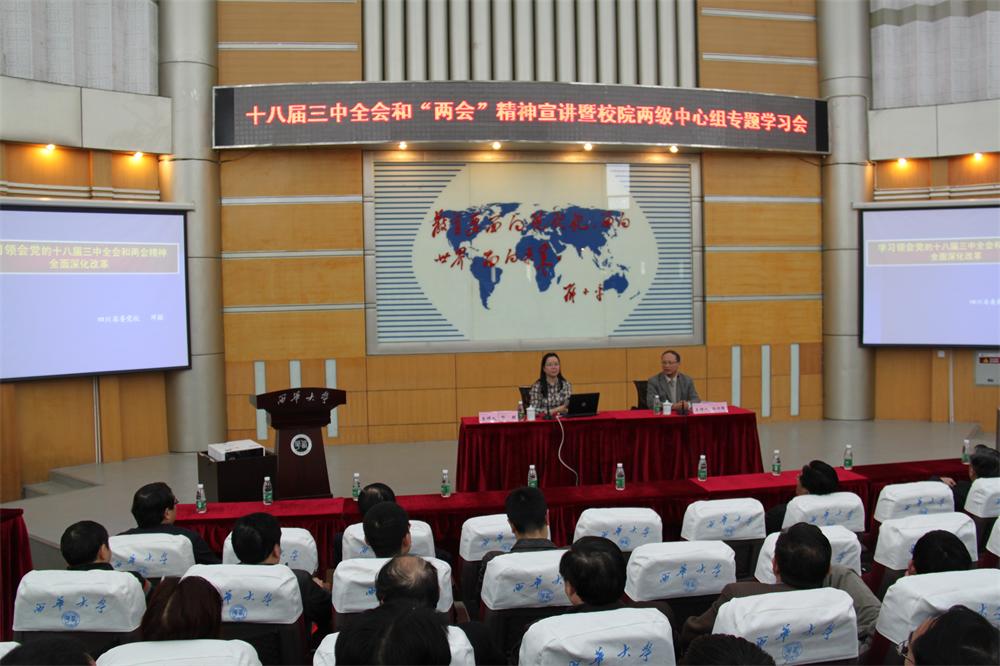 4月4日下午,四川省委党校、四川行政学院教务处处长邓颖应邀为我校师生作了一场题为《学习贯彻十八届三中全会和“两会”精神,深化体制改革》的专题宣讲。学校领导,副处及以上中层领导干部,校院两级中心组成员,各学院学工办主任、团委书记、专职辅导员,政治学院全体教师和学生代表聆听了报告。校长孙卫国主持宣讲会。