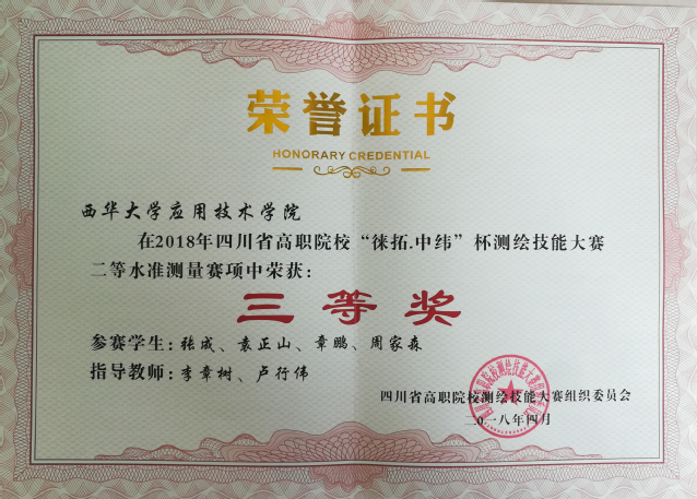 本次比赛为期两天,包括1:500数字测图和二等水准测量两项比赛内容,设单项奖一、二、三等奖,并将对获得各单项一等奖参赛队的指导教师颁发优秀指导教师奖。经过激烈角逐,我校王诗宇、万欣、秦渝杰、戢梁晋等同学组成的西华大学应用技术学院一队获1:500数字测图项目三等奖,张成、袁正山、章鹏、周家森等同学组成的西华大学应用技术学院二队获二等水准测量项目三等奖。