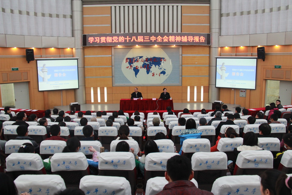 12月13日下午,省委宣讲团成员、四川大学马克思主义学院党委书记高中伟教授在四教报告厅为我校师生作了一场学习贯彻党的十八届三中全会精神专题报告。校领导、校级干部、副处及以上中层干部,哲学社会科学教师及学生代表共计300余人到场聆听报告。校长孙卫国主持报告会。 高教授的报告以习近平总书记在党的十八届三中全会上的重要讲话精神和全会通过的《中共中央关于全面深化改革若干重大问题的决定》为重点,简要介绍了《决定》的起草过程、内容构成、主要特点、逻辑框架及社会评价,并结合历史经验和国情省情,详细阐述了牢牢把握全面深化改革的重大意义、总体目标、创新举措和根本保证等方面的基本内容。高教授指出,全面深化改革既是坚持和发展中国特色社会主义,不断推进中国特色社会主义制度自我完善的需要,也是与时俱进的实现政治现代化,推进国家治理体系和治理能力现代化的需要。 高教授紧紧围绕“为什么改”、“改什么”、“怎么改”、“靠什么改”四个方面深入、透彻地诠释了十八届三中全会精神,并全面、细致地讲解了中央关于全面深化经济体制改革、政治体制改革、文化体制改革、社会体制改革、生态文明体制改革和党的建设制度改革的重大部署。他指出,党的十八届三中全会确定的改革总体思路明确,重点突出,着眼长远,力度空前,不仅顺应了世情国情党情的新变化,而且体现了党中央敢趟深水区、勇啃硬骨头的改革决心。干部师生要凝聚改革共识、坚定改革信心、坚强改革决心、保持改革耐心,把全会确定的全面深化改革各项任务落到实处,推动改革任务如期取得圆满成功。 孙校长对高中伟教授所作的精彩辅导报告表示感谢。他说,高教授从六大方面、十六个部分全方位地讲述了十八届三中全会精神,对全体干部师生学习全会精神有很大的启发。高教授是一个学习型、研究型的高校管理干部,在自己的学术研究领域有独特的见解和深厚的积淀,希望全校干部要以高教授为榜样,在做好本职工作的同时,做好自已的学术研究。他要求全体干部师生要认真学习贯彻十八届三中全会精神,坚定不移地全面推进改革,为实现中华民族伟大复兴的中国梦和推进我省“两个跨越”、实现我校建设省内一流、国内知名的教学研究型大学目标而努力奋斗。 高教授的精彩报告受到师生们的好评。政治学院2012级研究生付平同学表示:“听了高教授的报告,我对党的十八届三中全会精神的认识有了新的提升,对全面深化改革有了系统的了解。在今后的学习和工作中,我将以更加饱满的热情和积极的态度,肩负起时代赋予的责任与使命,让青春焕发出绚丽光彩。” 四川电视台等媒体来校作了采访报道,部分师生接受了采访,表达了自己学习和听取宣讲报告会后的体会与感受。 相关链接:http://202.115.144.65/movie/xihuashipin/2013-12-25/20242.html