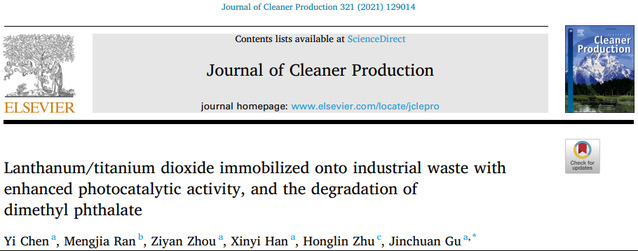 食品与生物工程学院谷晋川教授环境污染治理研究团队,一直致力于环境污染治理、环境材料、废弃物资源化和难处理废水催化氧化技术研究,近期以谷晋川教授为通讯作者,陈怡博士为第一作者在Journal of Cleaner Production(一区,IF2021=9.297)上发表题为“Lanthanum/titanium dioxide immobilized onto industrial waste withenhanced photocatalytic activity, and the degradation ofdimethyl phthalate”的研究论文。