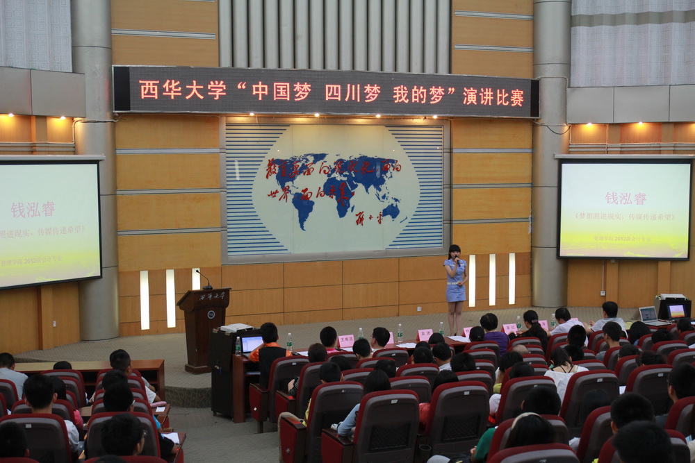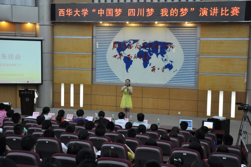 为深入贯彻落实党的十八大精神、深入开展“实现伟大中国梦、建设美丽繁荣和谐四川”主题教育活动, 5月29日晚,由校党委宣传部、学工部、校团委主办,西华主持人团承办的“中国梦·四川梦·我的梦”主题演讲比赛在四教报告厅举行。此次参加大赛的10名同学,他们曾参加由党委宣传部主办的“青春 信念 梦想”主题演讲赛和校团委主办的“我的中国梦”主题演讲赛的选拔。国家级普通话测试员杨绍林,国家级普通话测试员、离退休工作处处长章红,党委办公室副主任蓝进、组织部副部长罗海、宣传部副部长山述兰、学生工作部副部长张新泉、校团委主持工作副书记王唯洁担任评委。各学院学工办主任及同学代表共300余人聆听了此次演讲。 来自电气信息学院2011级电气专业的1号选手王昆宇,一上台慷慨激昂的话语征服了现场的观众,一句“带着时代的最强音,扬帆起航,追逐中国梦,我的梦!”说出了他对梦想的渴望;来自后备军官学院2011级法学专业的夏勇杰,一身亮丽的军装,加上铿锵有力的声音,彰显了当代军人坚韧的性格,她说:“既然选择了远方,便只顾风雨兼程。”3号选手来自凤凰学院2012级新闻传媒专业的朱佳垚更是以幽默的生活语言,讲述她走在新闻路上的所见所闻,一句“带着2012级新闻传播班的梦想走在新闻路上”感动全场;一身浅蓝色的连衣裙,带着甜美的笑容,来自管理学院2012级会计专业的钱泓睿以“未见其人,先问其声”的方式走上台,饱含深情的话语引得现场阵阵掌声,将比赛推向了高潮,“梦想照进现实,传媒传递希望”便是她对自己传媒梦的最好诠释;最后来自凤凰学院2012级新闻传播专业的池小琪讲述了她的梦想,无拘无束的她游览过了很多地方,她说:“旅行的意义不在于走过多少路,看过多少风景,而是茫茫人海中的感动。让我们都欢喜的活着。”坚定了她在新闻路上的梦想。 最终,来自管理学院的钱泓睿以最高分获得冠军,凤凰学院朱佳垚、外国语学院王婉瑶获得二等奖。 国家级普通话测试员杨绍林在点评演讲时说:“选手们准备充分,认真负责,把自己的梦想都落到了实处,付出了行动,相信当每个人梦想的实现,就是中国梦实现的时候。” 谈起获奖感受,冠军得主钱泓睿激动不已,她说:“从第一次参加主持人比赛,再到朗诵比赛,再到今天的演讲大赛,自己一步步在尝试,一步步在成熟,很享受每个过程。”说到以后的打算,她表示自己的梦是传媒梦,不管成功与否,都会坚定地一直走下去。 |