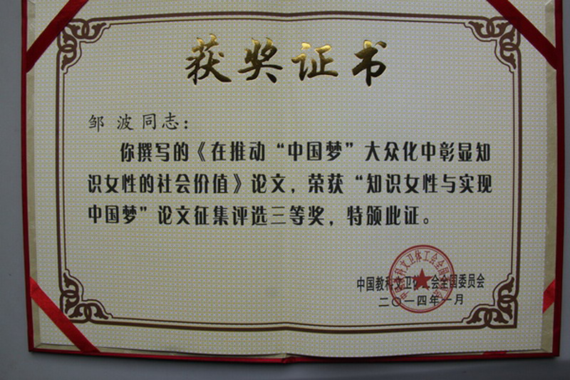 2013年6月中国教科文卫体工会全国委员会开展了“知识女性与实现中国梦”论文征集评选活动。近日,此次论文征集评选活动的结果揭晓,我校工会组织申报、推荐的人文学院邹波老师撰写的《在推动“中国梦”大众化中彰显知识女性的社会价值》论文荣获此次论文征集评选活动的三等奖。 中国教科文卫体工会全国委员会开展此次活动,旨在以此为契机,进一步重视和加强女职工理论研究工作,创新和完善女职工理论研究工作机制,鼓励和带动更多的知识女性参与到理论创新与实践中来,推动全国教科文卫体工会女职工理论创新工作再上新台阶。