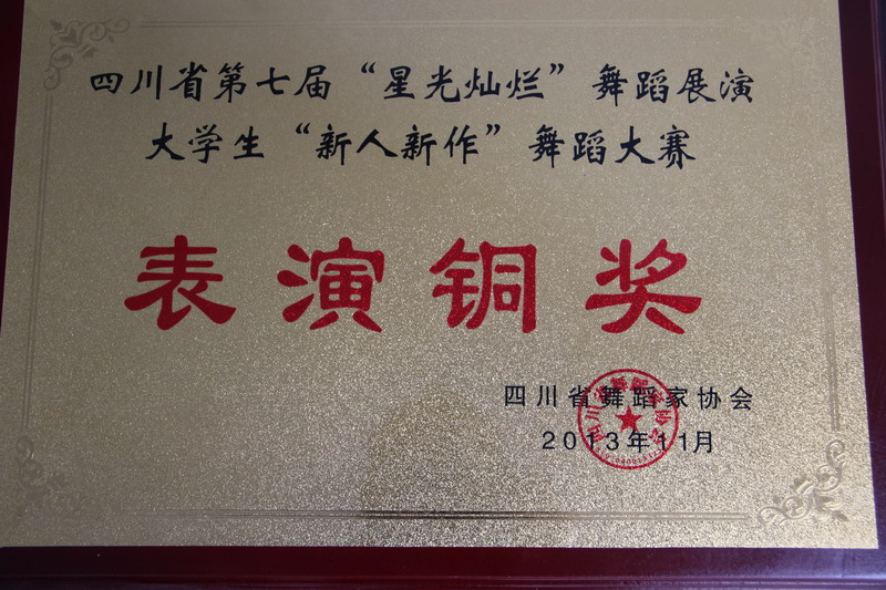 11月22日,由四川省舞蹈家协会主办的第七届“星光灿烂”舞蹈展演大学生“新人新作”舞蹈大赛在四川省歌舞剧院举行。经过激烈角逐,我校艺术学院选送的3个舞蹈作品分别获得本届比赛的表演金奖1项,表演铜奖1项,创作优秀奖1项。我校荣获优秀组织奖。其中,曾焯、路耀武指导的现代舞《那年剪短发》获表演金奖;路耀武、赵晓光指导的蒙古舞《心系草原》获表演铜奖;路耀武、赵晓光指导的蒙古舞《祭礼长生天》获表演优秀奖。