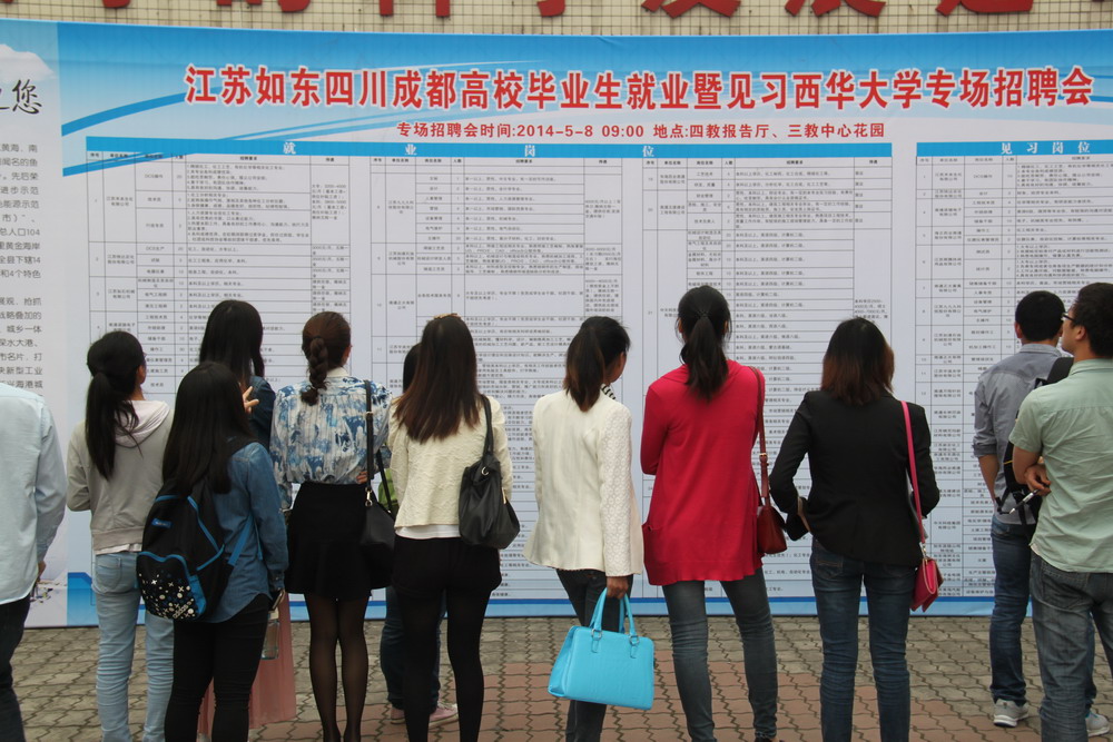 5月8日上午,江苏如东县副县长阮平章带领县委组织部、人社局、科技局以及30家企业来校举行专场招聘,为我校毕生生提供了800余个工作岗位,为大三的同学提供了300余个实习岗位。同时,成都周边的30余家用人单位也应邀来校开展专场招聘。 学校高度重视毕业生就业工作。为促进毕业生充分就业,学校相关部门积极拓展就业市场和渠道,主动出击,邀请省内外企业来校宣讲、招聘。一大早,校党委副书记王小林,招生与就业处处长阮永生、副处长杨洪来到招聘现场,与阮平章副县长一行亲切交流,并共同看望来校招聘的用人单位和求职学生,了解单位需求和学生就业情况。 来自江苏九九久科技股份有限公司人力资源部的朱经理表示,她对我校毕业生比较满意,认为同学们普遍都比较好学,很多人还选修了双学位,同时她建议,要注重吃苦耐劳精神的培养,要爱岗敬业,做到干一行爱一行,不要轻易放弃。江苏黄海汽配股份有限公司的孙经理表示,我校学生的理论知识学得扎实,对自己的定位也比较准确,她也希望毕业生要多参加社会实践,增强自己的实际动手能力,要热爱自己的工作岗位,保持对工作的兴趣和热情。 据介绍,江苏如东县近几年来经济发展很快,其工业以风电设备制造产业、太阳能光伏电池产业、汽车电子信息产业、重型基础化工产业等为主,拥有亚洲最大的毛巾、防护手套和铁链生产及出口基地。由于经济发展方式的转型,企业的转型,对人才的缺口需求较大,县委、县政府为此加大了人才引进力度,也出台了相关引进人才优惠政策,如本科生、硕士生到如东县工作,除工资以外,政府还将分别给予500元和1000元的生活补助。同时,对到如东县企业实习的大学生提供便利条件。 阮永生处长表示,江苏如东的企业来校招聘,反映了我校人才培养和专业设置的优势,往届毕业生们在江苏的表现得到用人单位的认可,受到用人单位的喜爱。这次,他们来校招聘毕业生和实习生之外,还将与学校签订科技合作与人才合作协议,建立并保持长期的合作机制。 据悉,5月16日,学校将组织相关人员前往宁波,进一步拓展学生就业渠道,为大三学生开展暑期实习提供更多机会,为企业和学生之间搭建一个相互了解的平台。