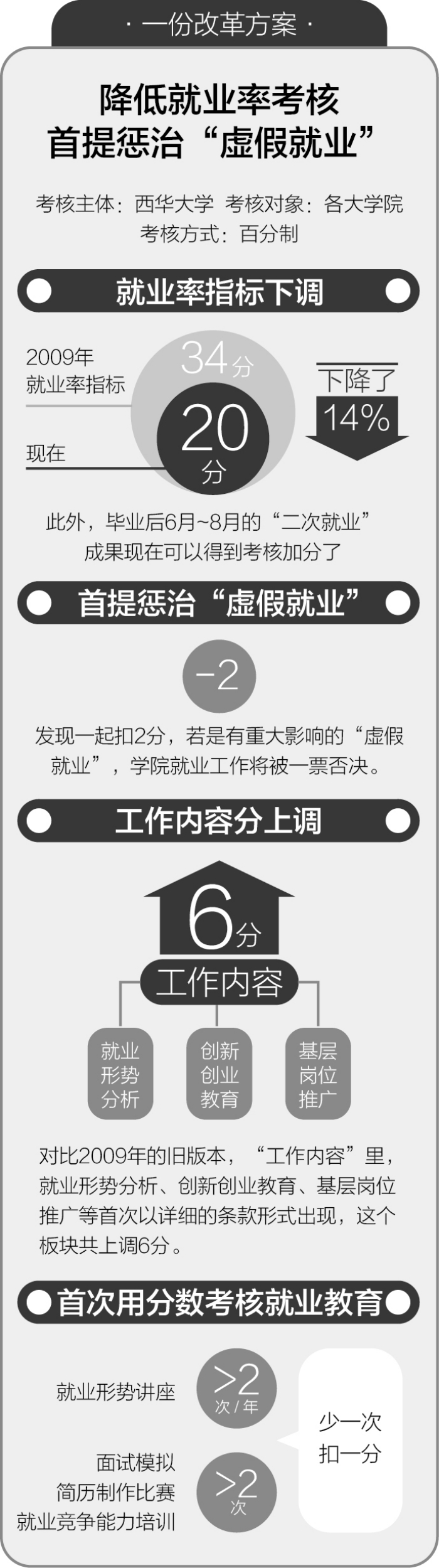 近日,西华大学招生与就业处处长阮永生主持召开了一次讨论会,他的身边坐着8位来自各个学院分管就业的副书记。他们讨论的是《西华大学毕业生就业工作年度考核指标体系》最新版的定稿,这是2009年来修订幅度最大的一次。接下来,该指标体系将下发到各个学院陆续实施。在这份最新的指标中,就业率占的比例出人意料地大幅缩水:从34分下调成20分。同时,“虚假就业”是唯一“一票否决”的指标。 “一家只有30多人规模的公司,一口气签了十几个学生;一个计算机公司,给7、8个艺术设计的学生盖章,你觉得正常么?”阮永生很生气。 “我不担心就业率下降。做好就业教育的过程,自然会有好结果。”他表示,对于新设项目的量化办法,各学院正在探索新的执行办法。 一个严峻现实> “老路不好走了 必须做出调整” “最高峰时,就业率考核比例占到了60分。” 所有指标中,就业率比例下调最引人注意。为提高就业率,多数高校把就业工作看成是“战役”,成都一所独立学院就业部负责人就曾对记者说,就业率是他们的生命线。 “我们必须做出调整。”阮永生坦承,以前的思路主要是拓宽就业市场,这样就能邀请足够多的企业来学校开招聘会。有了这个平台,给各学院定下就业率目标去完成,似乎并不难。但这两年他逐渐觉得,老路不好走了。即使西华大学每年还能按照1:3,即一个学生提供3个岗位量来开双选会,但正如阮永生所言,“在学生看来,有很多无效岗位。”因为60%的岗位属于服务业,比如销售,这对一所工科见长,尖子生大多出自制造类专业的高校来说,并不对口。 阮永生认为,就业市场的开拓是有限的,要想让学生找到工作,多练内功才是办法。这就是新考核的思路:提高教师做就业教育的水平,引导学生转变就业观念,提升就业技能等。 一种破题办法> 在就业率上给老师“松绑” 重视就业教育 新考核对“虚假就业”重拳出击,甚至有一票否决的规定。对此,阮永生表示,下调就业率分数,鼓励老师把更多的精力投入到就业指导与服务的过程中,“其实也有避免‘虚假就业’的考虑。” “很简单,如果光盯着就业率,那就是为了就业率而搞就业工作。都想着怎么把比例提高,忽略了就业教育的过程。”阮永生并不避讳地说,他不是没发现过这类问题。去年毕业时,招就处进行了自查。4、5个老师用一周时间给各用人单位打了700多通电话,发现学生已经签好的70多份协议书有问题。阮永生很生气,“一家只有30多人规模的公司,一口气签了十几个学生;一个计算机公司,给7、8个艺术设计的学生盖章,你觉得正常么?” 他坦承,就业工作有矛盾。面对就业率考核,各学院会出台激励机制,把目标分解给老师去完成。操作中,不排除有老师会着急,对学生讲出“你不签协议就不能论文答辩,就不给毕业证”等过激的话,让学生签了假协议。 而破解难题的办法之一,就是在就业率上给老师“松绑”,比如,毕业后6月~8月的“二次就业”成果也有考核加分,“这样就不会逼着老师硬要在毕业前让学生签协议,给大家多一点选择和考虑的时间。”阮永生强调,“松绑”的同时,更要给就业教育这个过程“加码”,比如创新创业能力培养、投简历面试技巧、职业定位与人生选择等。 对此,外国语学院副书记曾国勇感同身受,“以前都拿就业率衡量,对就业教育的过程规定得较模糊,这次的考核完全换了个新导向。”对照新方案,他很快梳理出几项新的工作:要把职业规划和就业指导课程变成必修,学生从大一就接触,每学年的主题都不一样。(成都商报记者 江浪莎) 相关链接: 《成都商报》:西华大学将大幅降低就业率考核 http://e.chengdu.cn/html/2014-04/03/content_462677.htm 《中国教育在线》:西华大学将大幅降低就业率考核 首提惩治“虚假就业” http://career.eol.cn/kuai_xun_4343/20140403/t20140403_1094052_1.shtml 《新浪网》:西华大学将大幅降低就业率考核 http://news.sina.com.cn/o/2014-04-03/041029853301.shtml 《四川新闻网》:西华大学将大幅降低就业率考核 首提惩治“虚假就业” http://scnews.newssc.org/system/20140403/000243693.html 《四川在线》:西华大学将大幅降低就业率考核 首提惩治“虚假就业” http://sichuan.scol.com.cn/cddt/content/2014-04/03/content_7355084.htm |