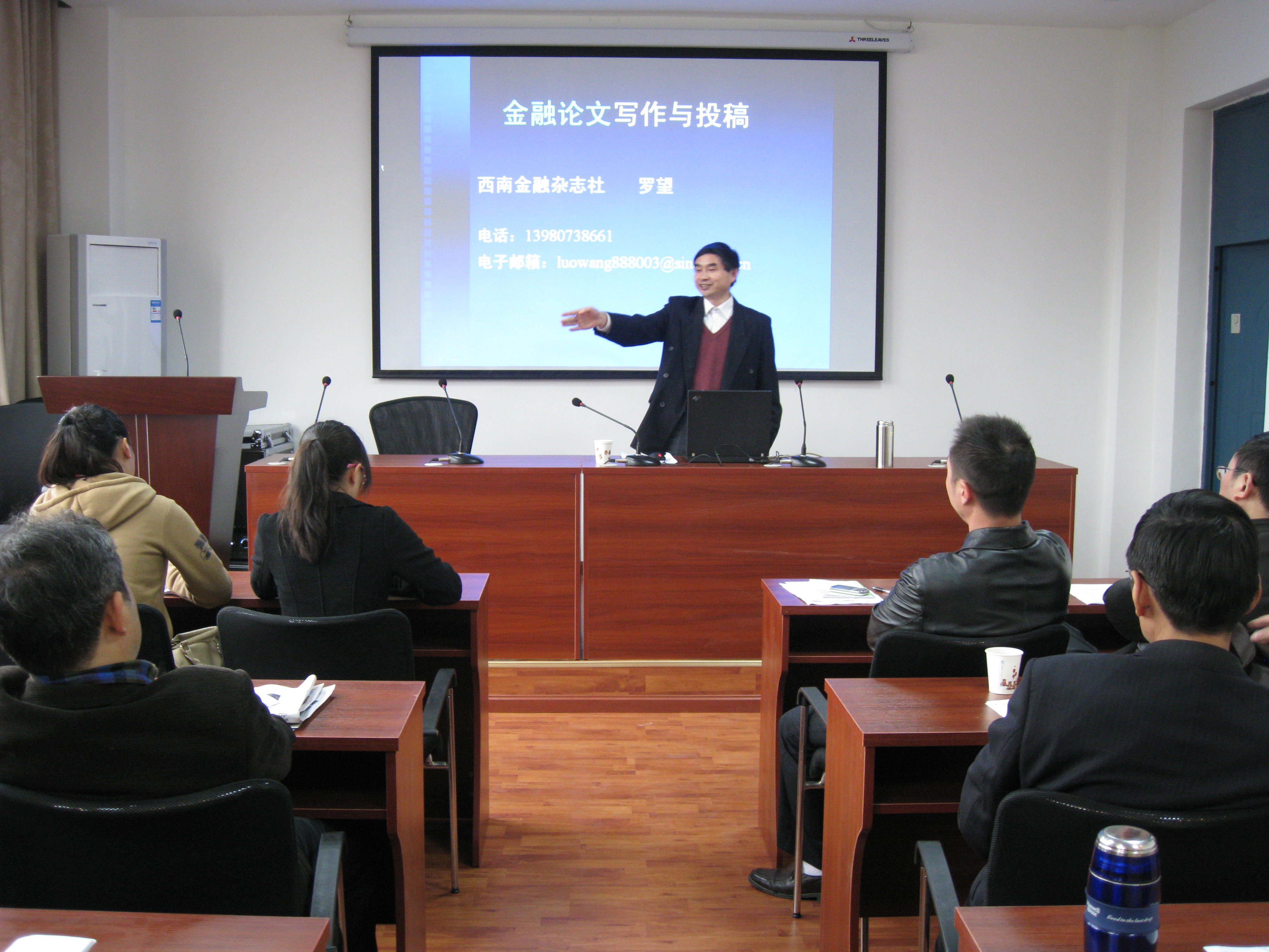 11月24日下午4:30,西南金融杂志社社长兼主编罗望应我校经济与贸易学院的邀请,在经济与贸易学院多功能会议室作了题为“金融论文写作与投稿”的讲座。经济与贸易学院主持工作副院长卓武扬、副院长兰虹及部分师生聆听了讲座。 罗主编就如何“提高金融写作水平”展开了话题,就“树立正确的世界观”、“深入社会实践”、“加强语言与写作修养”等方面作了深入的讲解。在论文的写作方法上,罗主编首先提到论文的选题要准确得体、醒目、简炼,抓住论文写作的五个点和五个度,即热点、焦点、重点、特点、盲点; 敏感度、深度、宽度、厚度、温度。其次,他强调要明确论文的三个要素:论点、论据、论证,并注重论文的写作格式。罗主编还指出了要提高投稿的命中力,一定要做到有特色、有新意、贴近读者、集中、深刻、简炼。 最后,罗主编与在场师生分享了写作投稿的技巧,并与大家进一步的交流探讨。本次报告丰富了学院师生在金融论文写作与投稿发面的知识,对以后的工作和学习有很好的指导作用。