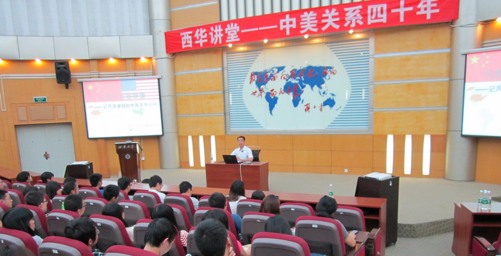 5月2日19:00,由校团委主办、政治学院团委承办的西华讲堂之《中美关系四十年》在四教报告厅举行。本次讲堂的主讲人是我校首席教师、政治学院副院长郑小明副教授,讲座由政治学院团委书记石元鹏主持。各学院的学生和部分青年教师聆听了本次讲座。