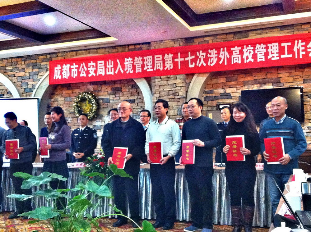 12月21日,成都市公安局出入境管理局第十七次涉外高校管理工作会议在蒲江召开。本次会议总结了本年度全市涉外高校对常住境外人员管理的工作情况并对表现突出的高校及个人进行表彰。四川大学国际合作与交流处、西华大学国际合作与交流处等十所高校的外事部门获得了先进单位的荣誉称号。 颁奖现场(右一为我校国际合作与交流处正处级调研员张家川) |
