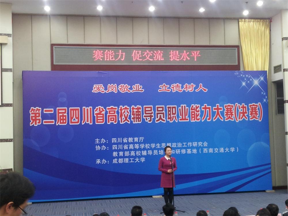 由四川省教育厅主办的全省第二届高校辅导员职业能力大赛于3月27日至28日在成都理工大学举行,来自全省86所高校的86名辅导员代表参加了比赛。以小组第一名的成绩进入决赛的我校外国语学院辅导员曾真沉着应战,充分展示了我校辅导员的青春风采,最终获得本届大赛二等奖。