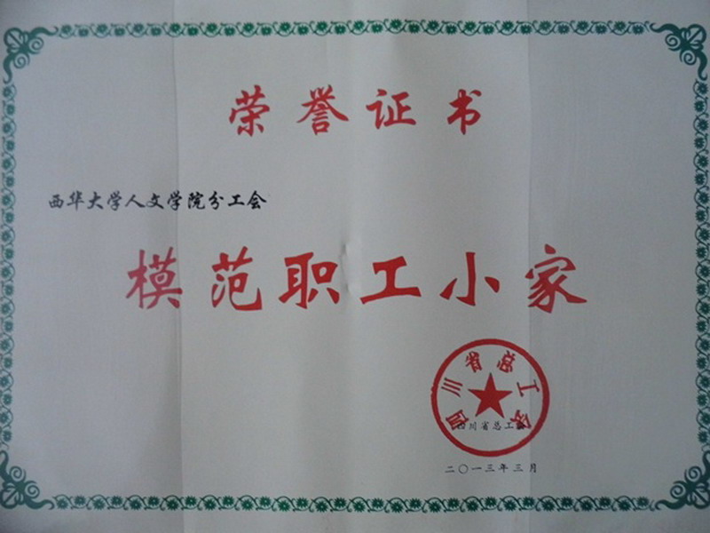 今年初,四川省总工会在全省工会系统进行了2013年基层工会 “模范职工小家”建设评比,我校推荐的人文学院分工会荣获“模范职工小家”称号。