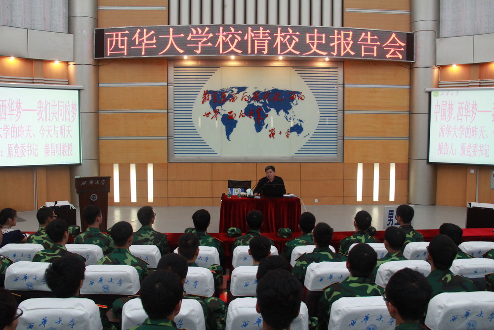 “在座的同学们,你们知道西华大学的办学精神是什么吗?” “西华大学的办学精神概括起来就8个字——知难而进、自强不息!” “要抵制各种诱惑,规划好自己的未来,未来就在你们的手中。” 这是9月11日晚,原学校党委书记秦昌明教授在为材料科学与工程学院2013级新生作校情校史报告时的场景。 四教报告厅座无虚席,材料科学与工程学院的300余名新生在此认真聆听了秦昌明教授所作的题为《中国梦、西华梦、我们共同的梦——西华大学的昨天、今天与明天》的校情校史报告会。学生工作部副部长王强主持报告会。 秦昌明教授曾担任数学教研室主任、系主任、校办主任、副校长、校党委书记,长期工作、生活在西华,对我校校情校史相当了解,他见证了西华从建校、艰苦创业、曲折发展、快速发展等全过程。 首先,秦昌明教授满怀深情地回顾了在创业时期,与首任院长杨诚一起克服重重困难,奠定了西华大学最初局面的情景。秦教授通过对办学条件、生活、交通、通信、住房等方面的纵向对比,结合自己的亲身经历和体会,用幽默风趣的语言向在场新生生动诠释了 “知难而进、自强不息”的深刻内涵。 秦教授向同学们细致地讲解了西华大学的历史沿革,并从西华在艰苦创业时期(1960~1966年)、曲折发展时期(1966~1976年)、改革开放时期(1977~2002年)、发展新时期(2003~今)四个时期,向大家讲述了一代代的西华人不断克服各种困难与挫折,努力发扬“知难而进、自强不息”的西华精神的故事。同时,秦教授还为大家介绍了自建校以来,学校在教学质量、师生人数及素质、学科力量、校园规模、生活质量、教学设施、社会声誉等方面发生的翻天覆地的变化,并通过具体的图片、详实的数据、生动的实例让新生们对西华的校情校史有了全面细致的了解。 最后,秦教授寄语在场新生“要抵制各种诱惑,规划好自己的未来,未来就在你们的手中。”他希望同学们能自觉传承西华精神,尽快适应大学生活,努力完成从中学生到大学生的转变,脚踏实地,刻苦学习,为实现中华民族伟大复兴的中国梦,为实现学校提出的“建设省内一流、国内知名的教学研究型大学”发展目标作出自己应有的贡献。 秦教授精彩的报告赢得了同学们热烈的掌声。同学们纷纷表示,从中受到了很大的教育和很好的启迪,并表示将牢记使命,不忘重托,尽快适应大学生活,为人生画上绚烂而重要的一笔。 据悉,校情校史教育是新生入学教育的重要环节,是培养学生爱校、爱院、爱专业系列教育活动的重要内容。通过此项活动的开展不仅有利于增强新生的历史使命感和社会责任感,而且有利于培养新生“我是西华人”的认同感、归属感和自豪感。 近年来,为帮助新生们尽快地了解西华、融入西华,激发同学们知校爱校热情,学校特邀原学校党委书记秦昌明教授、原学校党委副书记曾德祥教授为新生作校情校史报告。下两场报告会将于9月12日晚、13日晚分别在校体育馆内举行。