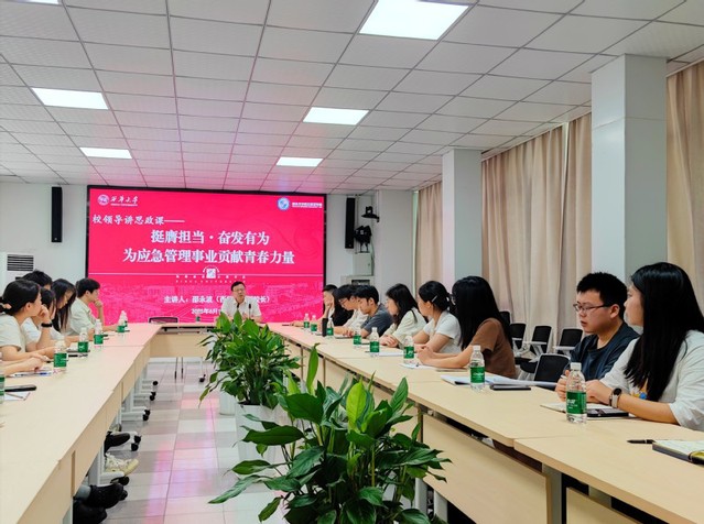 在思政课环节,邵永波结合国际国内形势与个人工作经历,与同学们深入交流“青年何为”的时代命题。他指出,应急管理事业直接关系人民群众的生命财产安全,事关经济发展和社会稳定。同学们未来的岗位可能是救灾现场的“第一响应者”,是风险排查的“前沿哨兵”,这是一份重要职业,更意味着责任与担当。他语重心长地告诉同学们要修好“三堂课”:一要修“德”,应急管理工作特别需要同理心,要学会换位思考;二要修“志”,在守护万家灯火中实现个人价值,在服务国家战略中充实精神世界,这才是应急管理的真谛;三要修“心”,保持乐观心态是职业发展的重要基石,未来无论面对救灾一线的紧急任务,还是日常工作的琐碎细节,乐观从容的心态都能帮助大家行稳致远。