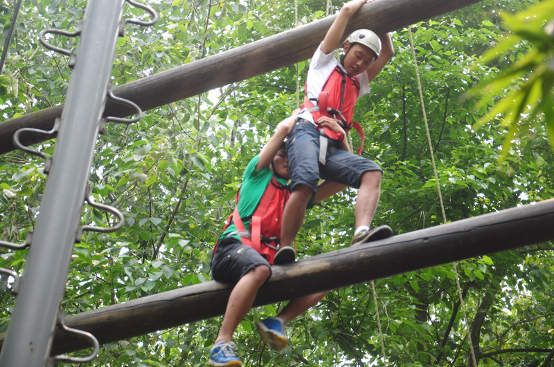 完成团队展示之后,教练便带领大家迎接今天的挑战:高空断桥和勇攀天梯。高空断桥是以“激发潜能、熔炼团队”为目的的户外运动,是经典的拓展训练项目之一。此项目是在离地面8米的高空中搭起一座独木桥,此桥中间断开,间距约1米,要求参与队员爬上高空,从一侧迈到另一侧,再从高空乘安全索降落。勇攀天梯是以“培养协作意识,共同努力达成目标”为目的的运动,此项目选用直径大于20厘米的木桩,呈梯状悬于12米的高空,最低的一根木桩距地面约1.2米,间距自下而上逐渐增大,小组成员分2人一组,相互配合登顶。