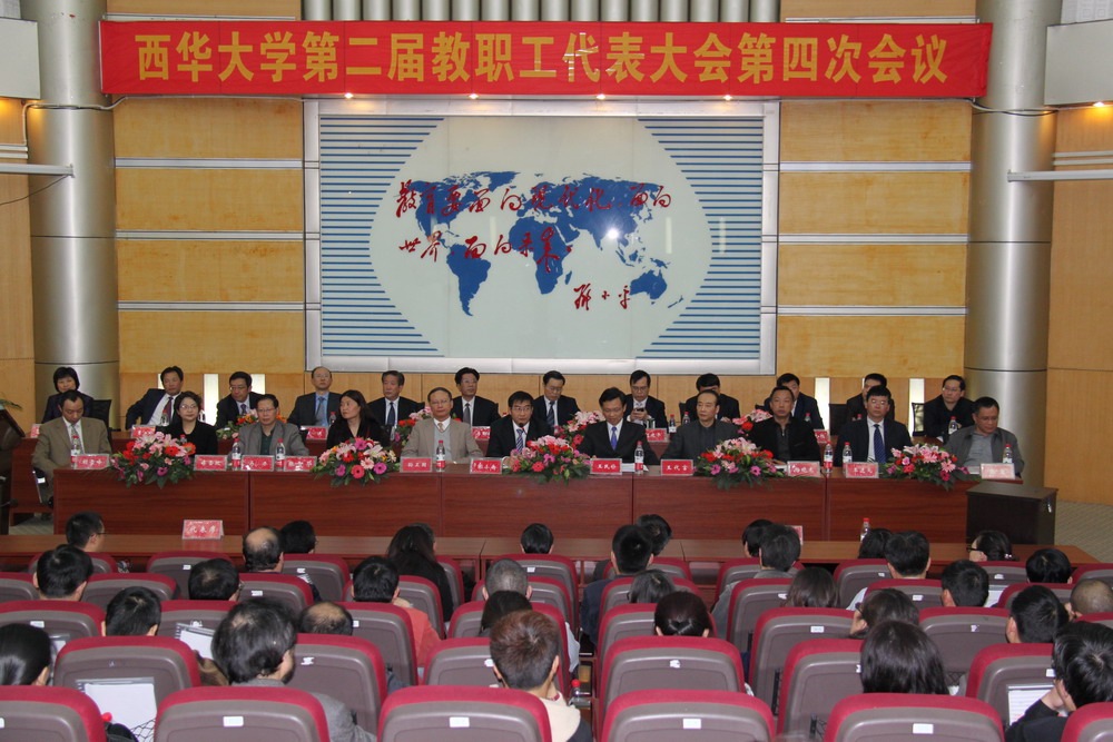 下午4:30,学校在四教报告厅举行了西华大学第二届教代会第四次会议闭幕式。会议审议通过了《2012年校长工作报告》、《2012年财务工作报告》、《西华大学校内分配办法(试行)》,审议决定了“西华大学教职工经适房小区名称”。