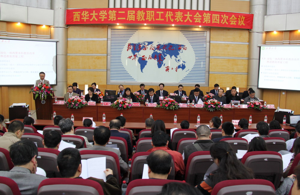 4月6日上午9:00,西华大学第二届教代会第四次会议在四教报告厅举行。与会代表认真听取了校长工作报告、财务工作报告、本次会议提案征集落实情况。全体教代会正式代表出席会议,非正式代表的分工会主席、各部门主要负责人、各学院党政一把手、部分特邀离退休人员列席会议。会议由校党委副书记、工会主席王民朴主持。